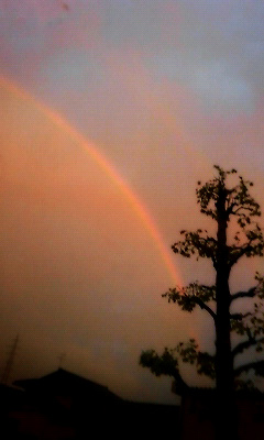 雨が降ってる夕暮時なのに、ものすごく綺麗な虹が出て、しかもよく見たらダブルレインボウで、なんていうか、感動した! 辛くて苦しくても、don’t mind! って気分になった。 って格好いいことを言ってみましたが、実は車の運転中でどうにも上手く撮影出来なかったので、写真ががっかり状態です。あーあ。